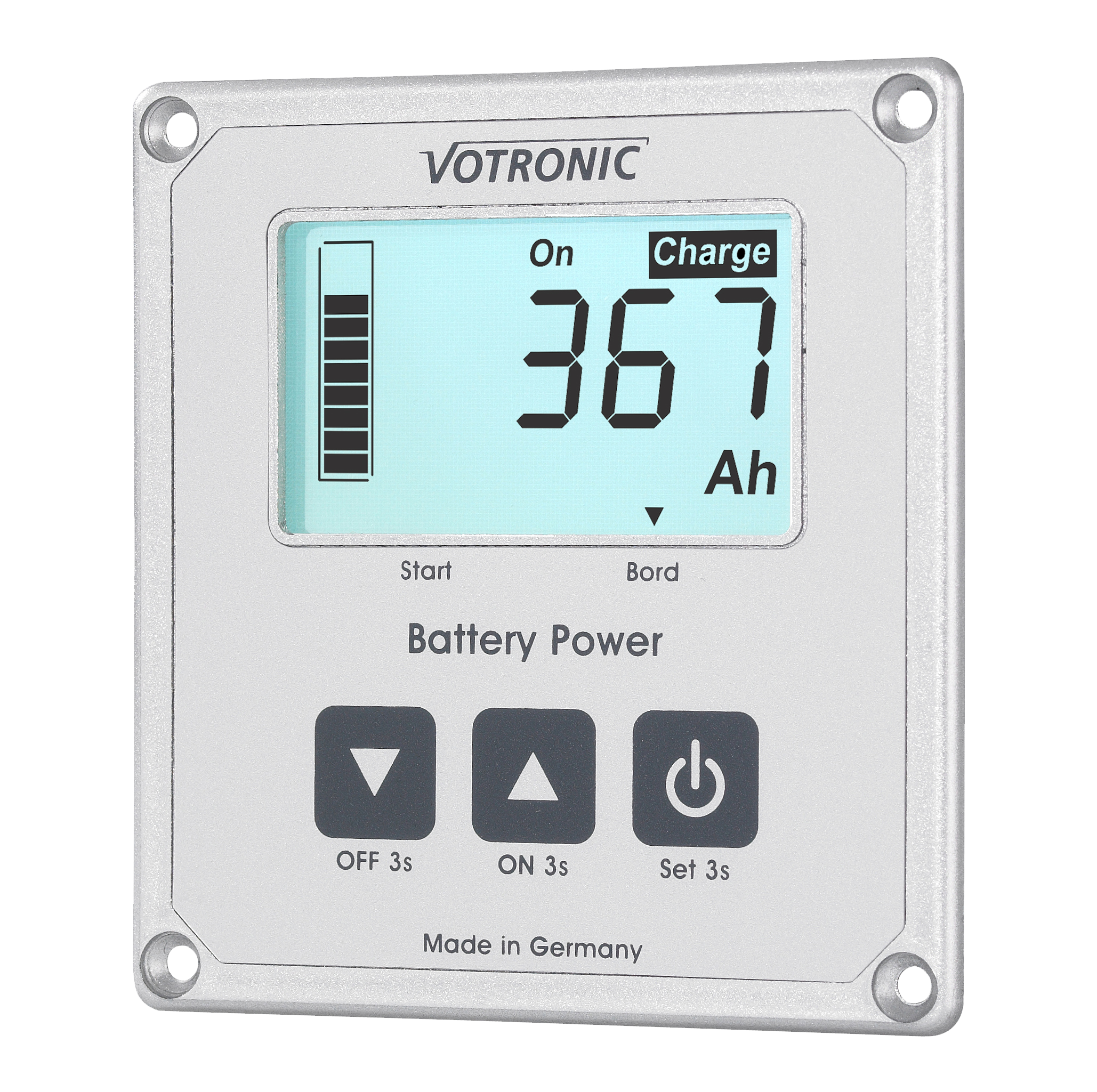 ボトロニックLCDバッテリーコンピュータ Sは、バッテリーの充電状態を正確に算出し、充電状態を「バッテリー燃料計」のように表示します。通常の電圧計/電力計とは異なり、残容量をアンペア・アワー(Ah)に換算し、またバッテリー特性に基づいて計算された残量を%で充電状態として表示します。更に、LCDバッテリーコンピュータ Sはメインバッテリーの電圧も表示します。本ユニット付属のスマートシャントは正確で品質に優れ、大きな過負荷容量にも対応します。バッテリーの充電状態に応じて、負荷や電源供給をリモートで接続・切断する機能を兼ね備えています。